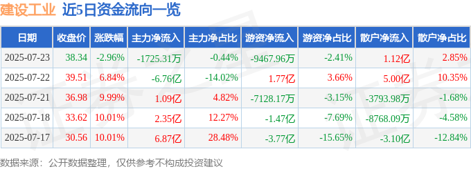截至2025年7月23日收盘,建设工业(002265)报收于38.34元,下跌2.96%,换手率24.82%,成交量100.03万手,成交额39.26亿元。