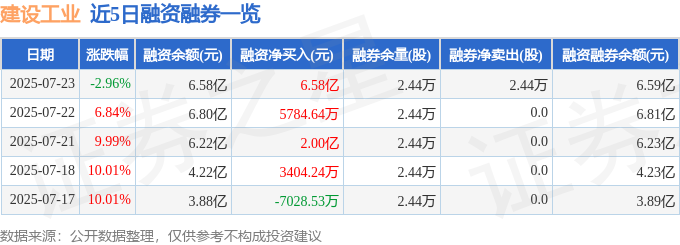 建设工业融资融券信息显示,融资方面,当日融资买入2.72亿元,融资偿还-3.86亿元,融资净买入6.58亿元,连续3日净买入累计9.15亿元。融券方面,融券卖出0.0股,融券偿还-2.44万股,融券余量2.44万股,融券余额93.55万元。融资融券余额6.59亿元。