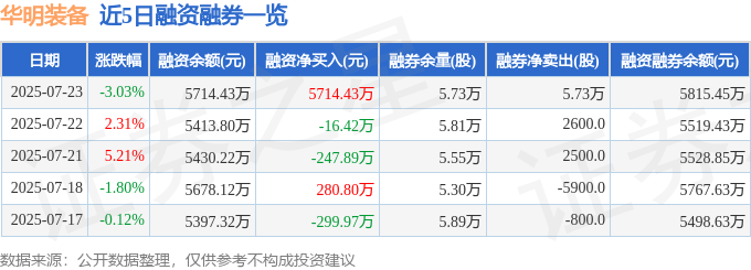 华明装备融资融券信息显示,融资方面,当日融资买入1097.72万元,融资偿还-4616.71万元,融资净买入5714.43万元。融券方面,融券卖出2100.0股,融券偿还-5.52万股,融券余量5.73万股,融券余额101.02万元。融资融券余额5815.45万元。