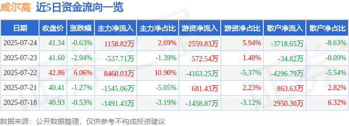 截至2025年7月24日收盘,威尔高(301251)报收于41.34元,下跌0.62%,换手率19.14%,成交量10.32万手,成交额4.31亿元。