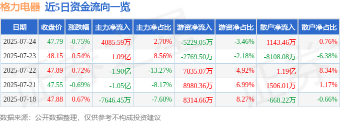 截至2025年7月24日收盘,格力电器(000651)报收于47.79元,下跌0.75%,换手率0.57%,成交量31.61万手,成交额15.11亿元。
