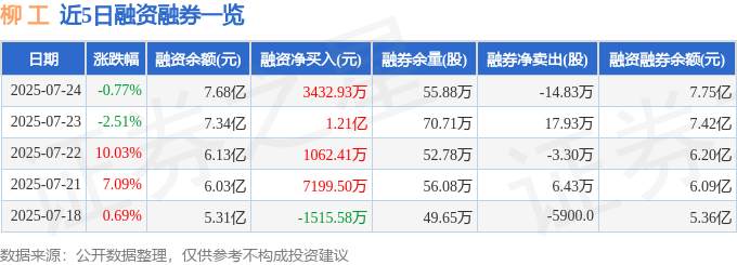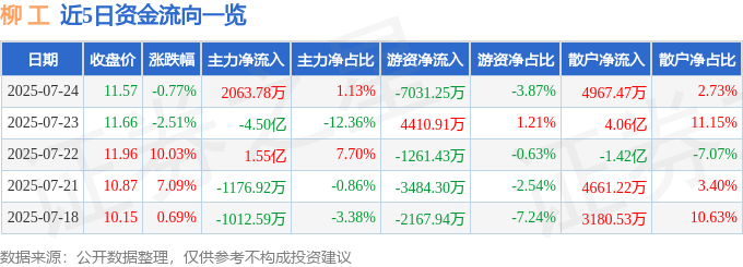 截至2025年7月24日收盘,柳 工(000528)报收于11.57元,下跌0.77%,换手率7.73%,成交量155.95万手,成交额18.19亿元。