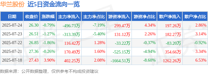 截至2025年7月24日收盘,华兰股份(301093)报收于26.3元,下跌0.79%,换手率1.67%,成交量2.62万手,成交额6905.08万元。