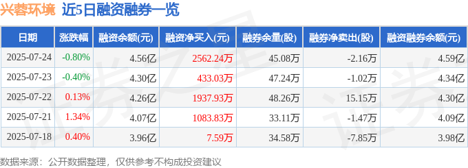 兴蓉环境融资融券信息显示,融资方面,当日融资买入3242.38万元,融资偿还680.14万元,融资净买入2562.24万元,连续3日净买入累计4933.2万元。融券方面,融券卖出0.0股,融券偿还2.16万股,融券余量45.08万股,融券余额336.75万元。融资融券余额4.59亿元。