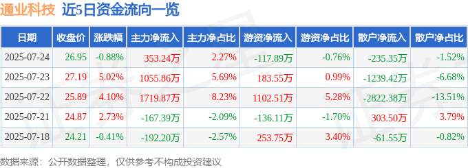 截至2025年7月24日收盘,通业科技(300960)报收于26.95元,下跌0.88%,换手率4.35%,成交量5.66万手,成交额1.55亿元。