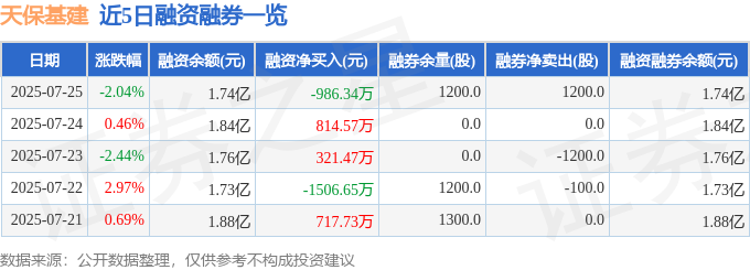 天保基建融资融券信息显示,融资方面,当日融资买入2090.04万元,融资偿还3076.37万元,融资净偿还986.34万元。融券方面,融券卖出1200.0股,融券偿还0.0股,融券余量1200.0股,融券余额0.52万元。融资融券余额1.74亿元。