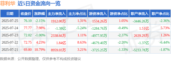 7月25日的资金流向数据方面,主力资金净流入1912.0万元,占总成交额1.31%,游资资金净流入1534.26万元,占总成交额1.05%,散户资金净流出3446.26万元,占总成交额2.36%。