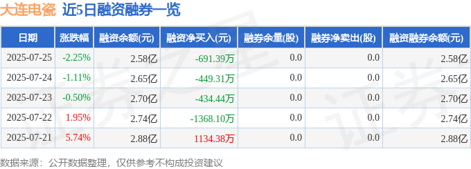大连电瓷融资融券信息显示,融资方面,当日融资买入1291.56万元,融资偿还1982.95万元,融资净偿还691.39万元。融券方面,融券卖出0.0股,融券偿还0.0股,融券余量0.0股,融券余额0.0万元。融资融券余额2.58亿元。