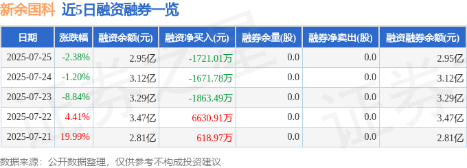 新余国科融资融券信息显示,融资方面,当日融资买入4996.15万元,融资偿还6717.16万元,融资净偿还1721.01万元。融券方面,融券卖出0.0股,融券偿还0.0股,融券余量0.0股,融券余额0.0万元。融资融券余额2.95亿元。