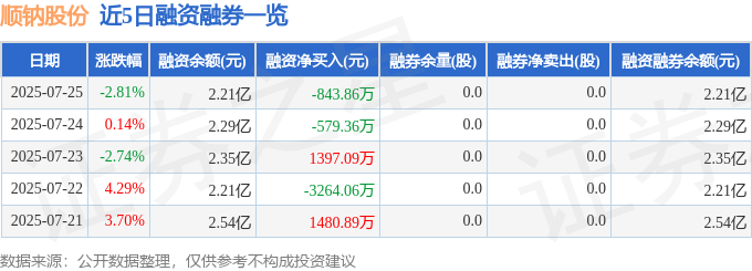 顺钠股份融资融券信息显示,融资方面,当日融资买入2207.24万元,融资偿还3051.1万元,融资净偿还843.86万元。融券方面,融券卖出0.0股,融券偿还0.0股,融券余量0.0股,融券余额0.0万元。融资融券余额2.21亿元。