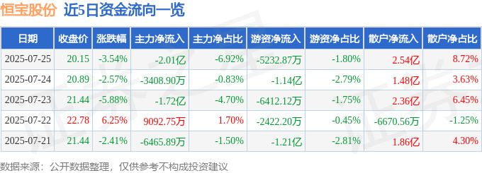 截至2025年7月25日收盘,恒宝股份(002104)报收于20.15元,下跌3.54%,换手率23.78%,成交量142.59万手,成交额29.11亿元。