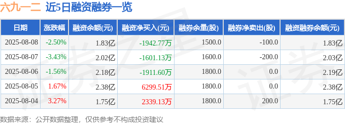 六九一二融资融券信息显示,融资方面,当日融资买入3242.53万元,融资偿还5185.3万元,融资净偿还1942.77万元。融券方面,融券卖出0.0股,融券偿还100.0股,融券余量1500.0股,融券余额24.52万元。融资融券余额1.83亿元。