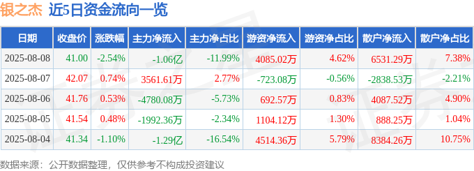 截至2025年8月8日收盘,银之杰(300085)报收于41.0元,下跌2.54%,换手率3.37%,成交量21.42万手,成交额8.85亿元。