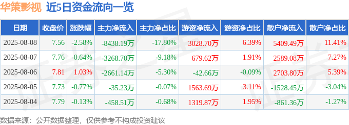 截至2025年8月8日收盘,华策影视(300133)报收于7.56元,下跌2.58%,换手率3.83%,成交量62.26万手,成交额4.74亿元。