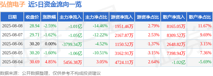 截至2025年8月8日收盘,弘信电子(300657)报收于28.94元,下跌2.59%,换手率5.14%,成交量24.07万手,成交额7.0亿元。
