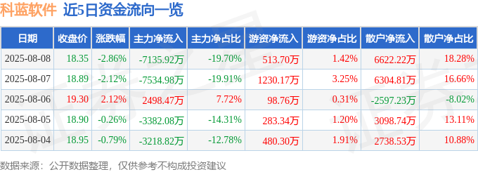 截至2025年8月8日收盘,科蓝软件(300663)报收于18.35元,下跌2.86%,换手率4.38%,成交量19.59万手,成交额3.62亿元。