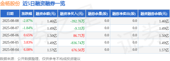 金杨股份融资融券信息显示,融资方面,当日融资买入1432.77万元,融资偿还1825.53万元,融资净偿还392.76万元。融券方面,融券卖出0.0股,融券偿还0.0股,融券余量0.0股,融券余额0.0万元。融资融券余额1.46亿元。