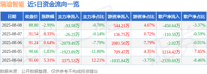 截至2025年8月8日收盘,瑞迪智驱(301596)报收于88.8元,下跌2.99%,换手率4.32%,成交量1.5万手,成交额1.34亿元。