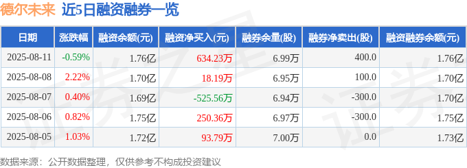 德尔未来融资融券信息显示,融资方面,当日融资买入1227.27万元,融资偿还593.04万元,融资净买入634.23万元。融券方面,融券卖出400.0股,融券偿还0.0股,融券余量6.99万股,融券余额35.23万元。融资融券余额1.76亿元。