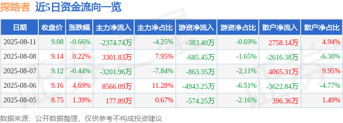 截至2025年8月11日收盘,探路者(300005)报收于9.08元,下跌0.66%,换手率7.02%,成交量62.03万手,成交额5.58亿元。