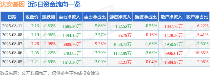 截至2025年8月11日收盘,达安基因(002030)报收于7.13元,下跌0.83%,换手率2.97%,成交量41.69万手,成交额2.97亿元。