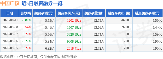 截至2025年8月11日收盘,中国广核(003816)报收于3.69元,下跌0.81%,换手率0.28%,成交量109.36万手,成交额4.03亿元。
