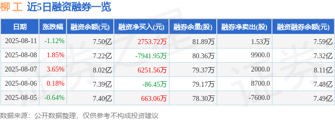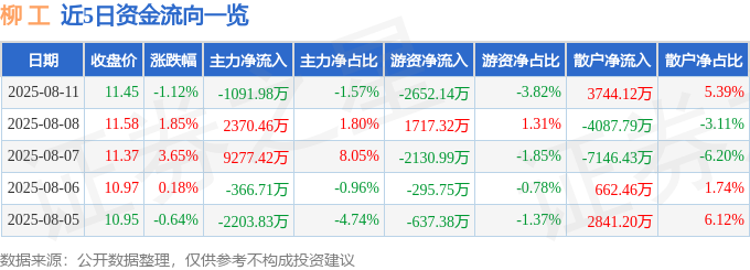 截至2025年8月11日收盘,柳 工(000528)报收于11.45元,下跌1.12%,换手率2.98%,成交量60.48万手,成交额6.95亿元。