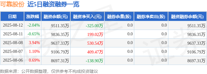可靠股份融资融券信息显示,融资方面,当日融资买入945.32万元,融资偿还1270.32万元,融资净偿还325.0万元。融券方面,融券卖出0.0股,融券偿还0.0股,融券余量0.0股,融券余额0.0万元。融资融券余额9511.35万元。