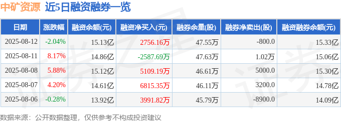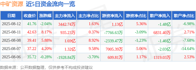 截至2025年8月12日收盘,中矿资源(002738)报收于41.76元,下跌2.04%,换手率7.28%,成交量51.77万手,成交额21.17亿元。