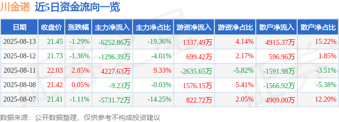 截至2025年8月13日收盘,川金诺(300505)报收于21.45元,下跌1.29%,换手率6.91%,成交量15.02万手,成交额3.23亿元。
