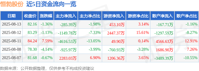 截至2025年8月13日收盘,恒勃股份(301225)报收于82.16元,下跌1.36%,换手率5.8%,成交量1.75万手,成交额1.44亿元。