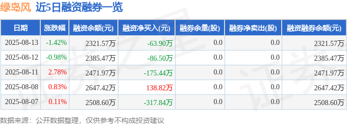 绿岛风融资融券信息显示,融资方面,当日融资买入182.86万元,融资偿还246.76万元,融资净偿还63.9万元。融券方面,融券卖出0.0股,融券偿还0.0股,融券余量0.0股,融券余额0.0万元。融资融券余额2321.57万元。