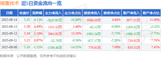 截至2025年8月14日收盘,锦富技术(300128)报收于5.35元,下跌4.12%,换手率4.84%,成交量62.8万手,成交额3.43亿元。