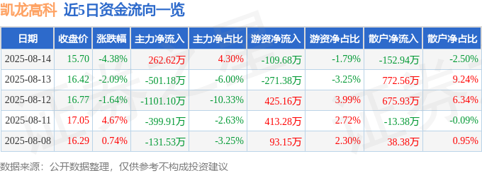 8月14日的资金流向数据方面,主力资金净流入262.62万元,占总成交额4.3%,游资资金净流出109.68万元,占总成交额1.79%,散户资金净流出152.94万元,占总成交额2.5%。