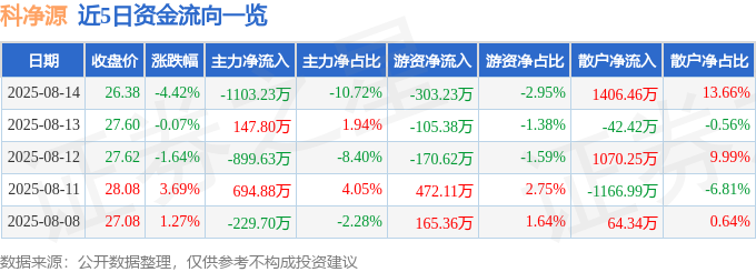 截至2025年8月14日收盘,科净源(301372)报收于26.38元,下跌4.42%,换手率9.28%,成交量3.82万手,成交额1.03亿元。