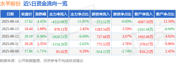 截至2025年8月14日收盘,水羊股份(300740)报收于17.62元,下跌4.45%,换手率5.7%,成交量20.47万手,成交额3.67亿元。