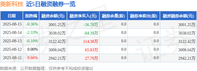 美新科技融资融券信息显示,融资方面,当日融资买入294.45万元,融资偿还331.23万元,融资净偿还36.78万元。融券方面,融券卖出0.0股,融券偿还0.0股,融券余量0.0股,融券余额0.0万元。融资融券余额3001.25万元。
