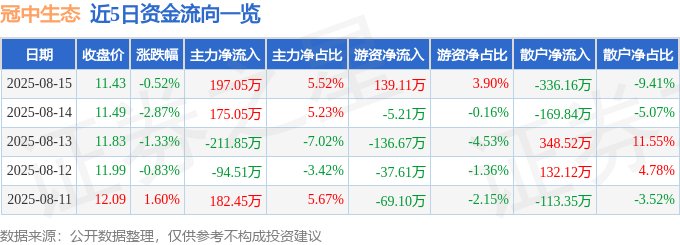 截至2025年8月15日收盘,冠中生态(300948)报收于11.43元,下跌0.52%,换手率2.38%,成交量3.11万手,成交额3571.27万元。