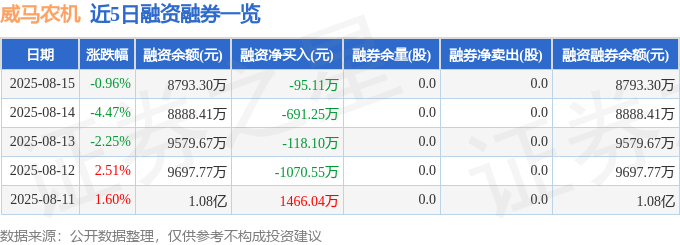截至2025年8月15日收盘,威马农机(301533)报收于41.47元,下跌0.96%,换手率14.61%,成交量4.16万手,成交额1.75亿元。
