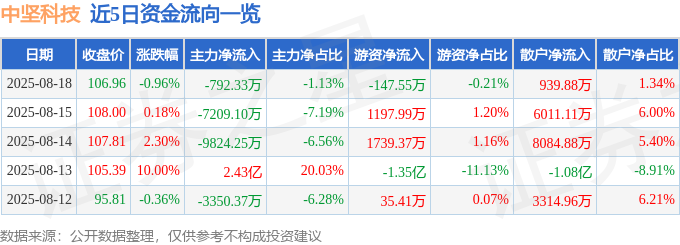 截至2025年8月18日收盘,中坚科技(002779)报收于106.96元,下跌0.96%,换手率3.98%,成交量6.59万手,成交额7.01亿元。