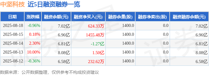中坚科技融资融券信息显示,融资方面,当日融资买入7482.79万元,融资偿还6858.46万元,融资净买入624.33万元。融券方面,融券卖出0.0股,融券偿还0.0股,融券余量1400.0股,融券余额14.97万元。融资融券余额7.02亿元。