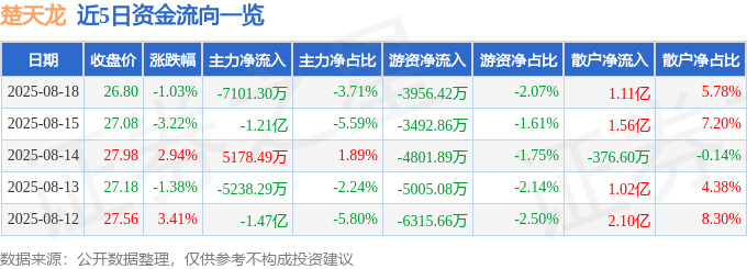 截至2025年8月18日收盘,楚天龙(003040)报收于26.8元,下跌1.03%,换手率15.61%,成交量71.33万手,成交额19.12亿元。