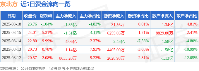 截至2025年8月18日收盘,京北方(002987)报收于23.76元,下跌1.04%,换手率14.06%,成交量118.61万手,成交额27.89亿元。