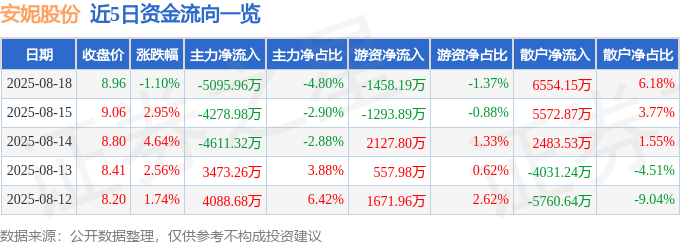 截至2025年8月18日收盘,安妮股份(002235)报收于8.96元,下跌1.1%,换手率21.31%,成交量117.94万手,成交额10.61亿元。