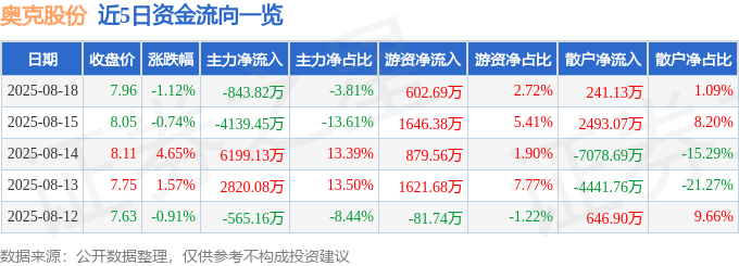 截至2025年8月18日收盘,奥克股份(300082)报收于7.96元,下跌1.12%,换手率4.09%,成交量27.73万手,成交额2.21亿元。