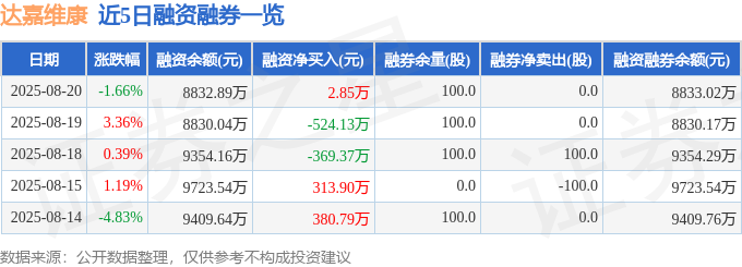 达嘉维康融资融券信息显示,融资方面,当日融资买入1488.89万元,融资偿还1486.04万元,融资净买入2.85万元。融券方面,融券卖出0.0股,融券偿还0.0股,融券余量100.0股,融券余额0.13万元。融资融券余额8833.02万元。