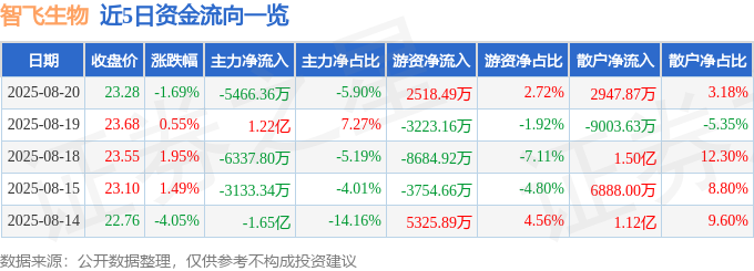 截至2025年8月20日收盘,智飞生物(300122)报收于23.28元,下跌1.69%,换手率2.82%,成交量39.85万手,成交额9.26亿元。