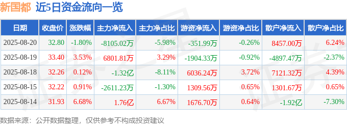 截至2025年8月20日收盘,新国都(300130)报收于32.8元,下跌1.8%,换手率9.58%,成交量41.62万手,成交额13.56亿元。