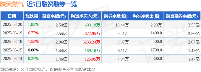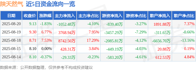 截至2025年8月20日收盘,陕天然气(002267)报收于9.13元,下跌1.83%,换手率2.53%,成交量28.11万手,成交额2.57亿元。