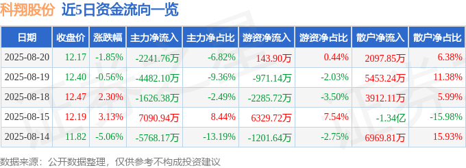 8月20日的资金流向数据方面,主力资金净流出2241.76万元,占总成交额6.82%,游资资金净流入143.9万元,占总成交额0.44%,散户资金净流入2097.85万元,占总成交额6.38%。